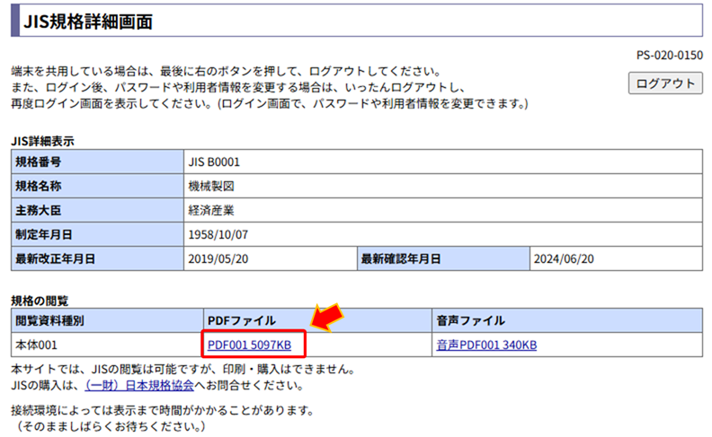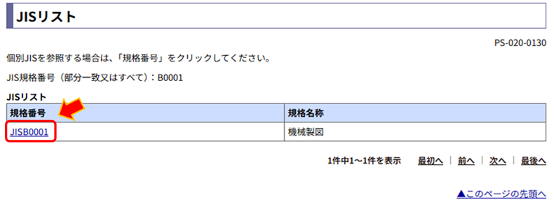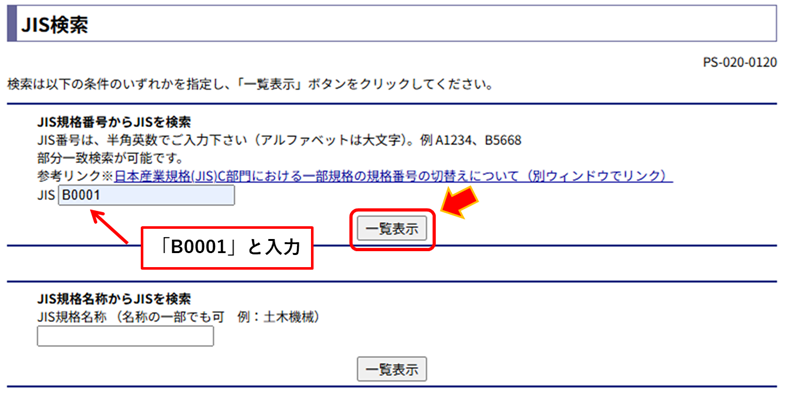 検索したいJISの規格番号を入力します(※今回の場合は「B0001」と入力)