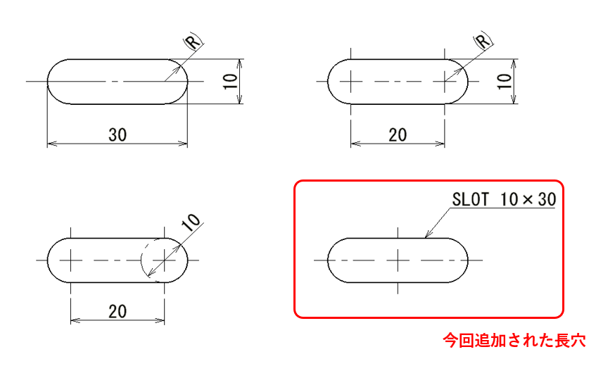 長穴は他のねじ穴やザグリ穴と違って、図面を書くのが多少手間がかかる穴だったので、個人的にはこの追加は非常にありがたいです。