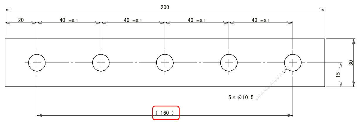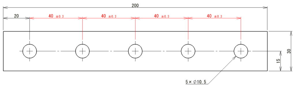 もし上記で40の穴ピッチに公差を入れていない際、JISの中級(ちゅうきゅう)だった場合「±0.3」となります。