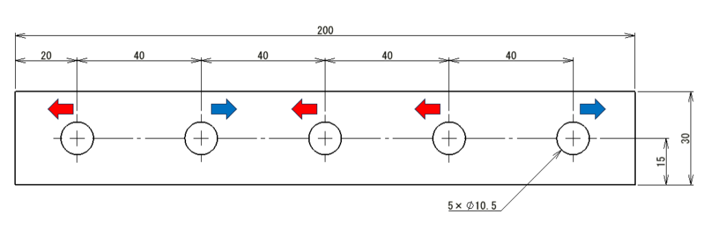 仮に穴ピッチ公差を±0.1に変更しても、下図のように左の穴と右の穴は、公差の積み上げた分だけズレる可能性があります